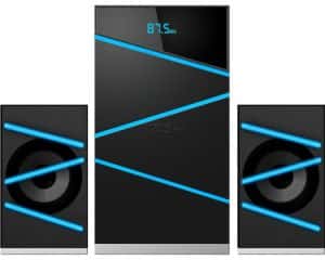 - 2.1 – эта акустика схожа с предыдущей, но имеет в комплекте сабвуфер. Он отвечает за воспроизведение низких частот (басов);